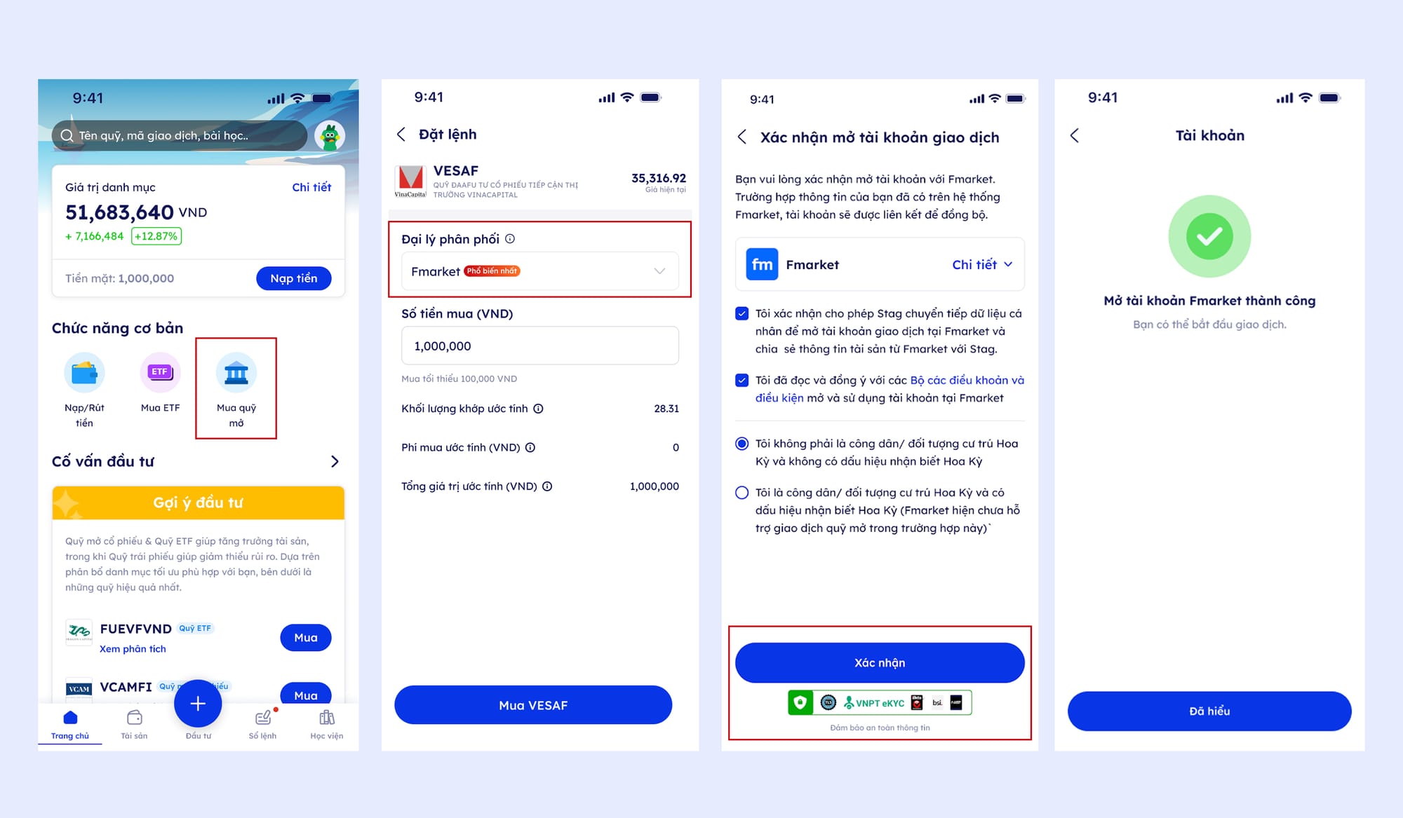 Bước 3: Xác nhận liên kết tài khoản Fmarket và bắt đầu mua quỹ mở với số vốn chỉ từ 10.000 VND.